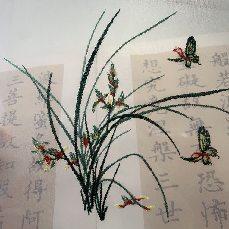 This embroidered piece captures a quiet moment in nature — delicate botanical forms accompanied by two softly fluttering butterflies. The composition feels light, balanced, and gently alive, bringing a sense of calm movement into still space.